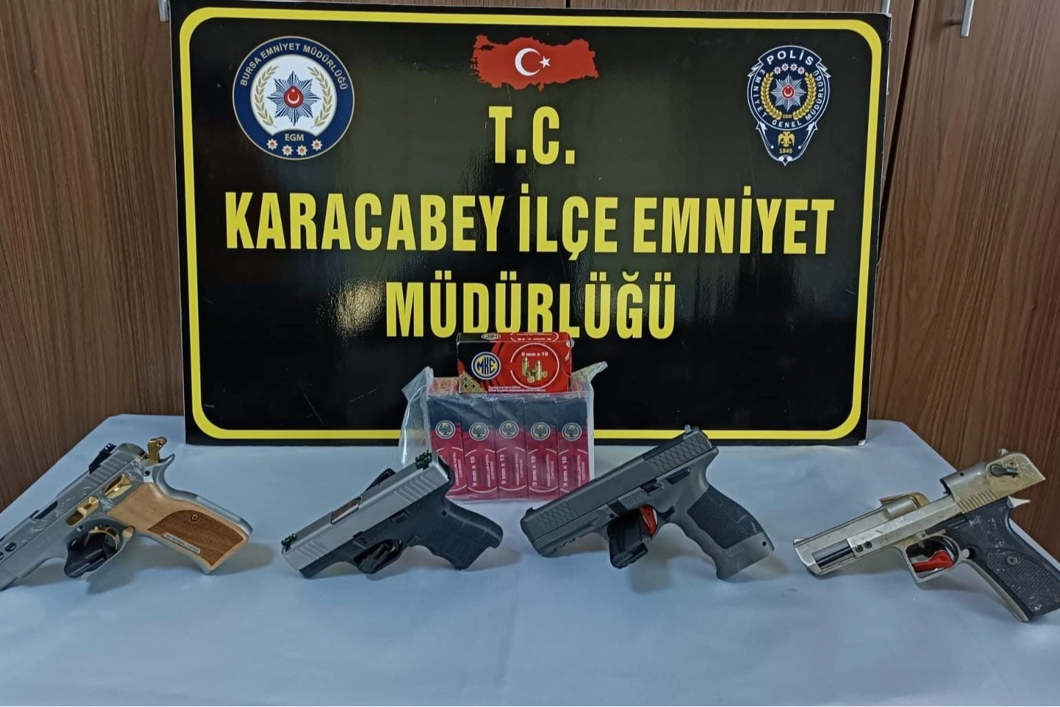 Karacabey İlçe Emniyet Müdürlüğü Asayiş Büro Amirliği ekipleri, ruhsatsız silah bulunduran şahıslara yönelik yapılan çalışmalar kapsamında Karacabey'in Hamidiye Mahallesi'nde bir eve operasyon düzenlendi. N.K. (42) adlı şahsın evine düzenlenen operasyonda arama yapıldı. Yapılan arama sonucunda 4 adet tabanca ve 273 adet fişek ele geçirildi. N.K. adlı şahsın emniyette ifadesi alındıktan sonra serbest bırakılırken, olayla ilgili başlatılan soruşturma ise sürüyor.