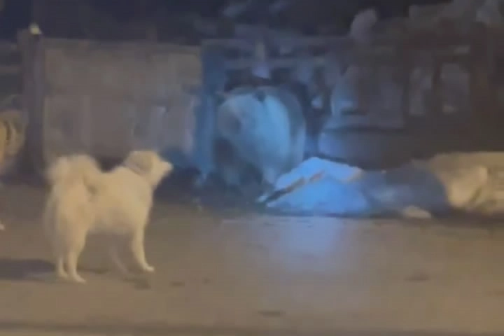 Koruyucu köpekler tarafından rahatsız edilen ayı bir süre yemek arayıp, daha sonra ormanlık alana doğru kayıplara karıştı. O anlar bir vatandaşın kamerasına saniye saniye yansıdı.