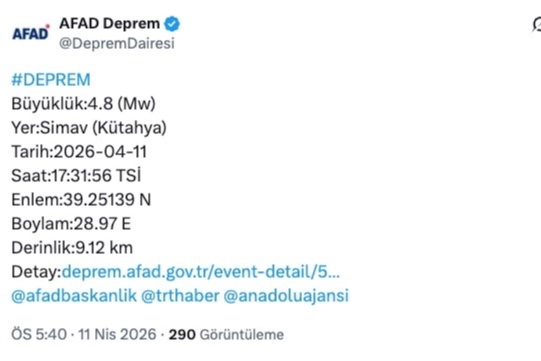 AFAD verilerine göre, saat 17.31’de Kütahya’nın Simav ilçesi merkezli 4.8 büyüklüğünde deprem meydana geldi. 4.8 büyüklüğündeki deprem Bursa ve ilçelerinden de hissedildi.