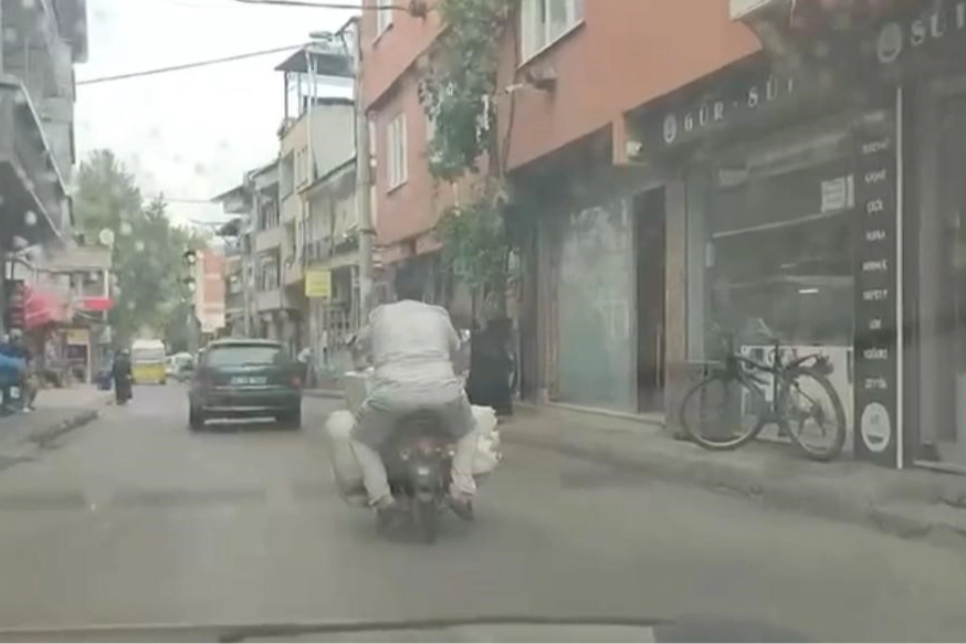 O anlar kameraya yansırken, motosikleti sürmekte güçlük çeken sürücünün rahat hareketleri 'pes' dedirtti. Merkez Osmangazi ilçesinde motosikletiyle trafiğe çıkan bir sürücü, motosiklete yüklediği eşyalarla kilometrelerce seyir etti. Kendi canını da hiçe sayan sürücü, uyarılara aldırış etmeden ilerlerken, ilginç yolcuğu gören trafikteki diğer sürücüler ise o anları şaşkınlıkla izledi. Motosikletli sürücü bir süre sonra gözden kaybolurken, tehlikeli yolculuk kameraya anbean yansıdı.