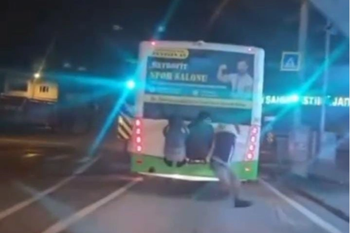Bursa’da seyir halindeki belediye otobüsünün arkasına tutunan çocuklar yürekleri ağza getirdi. Tehlikeli yolculuk, vatandaşlar tarafından endişeyle izlendi.