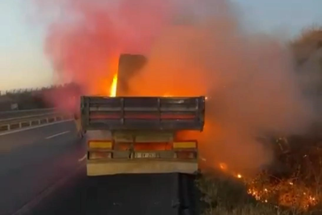 Bursa’nın Mustafakemalpaşa ilçesinde sürücüsünün idaresinde olan tırın dorse kısmında bir anda dumanlar yükseldi. Sürücünün durumu fark etmesiyle araç hemen kenarı çekildi. Hızla büyüyen alevler tırdan anayoldaki otluk alana sıçradı. Sürücünün ihbarı üzerine olay yerine itfaiye ekibi sevk edildi. Alev topuna dönen tırı söndüren ekipler yol kenarında otluk alana sıçrayan alevleri de hızla söndürdü. Tırın alev alev yandığı anlar kameraya yansırken, yangında korkulan olmadı. Olayla ilgili tahkikat başlatıldı.