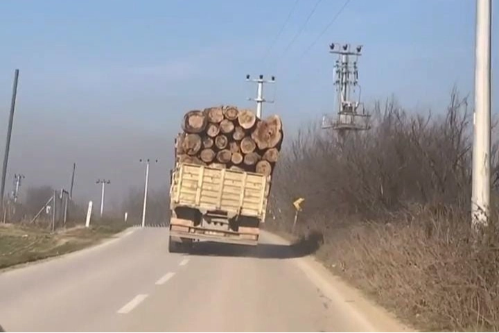 Olay, İnegöl-Ortaköy Mahallesi Yolu üzerinde meydana geldi. Sürücüsü ve plakası belirlenemeyen tomruk yüklü kamyonet, seyir halindeyken devrilme tehlikesi yaşadı.