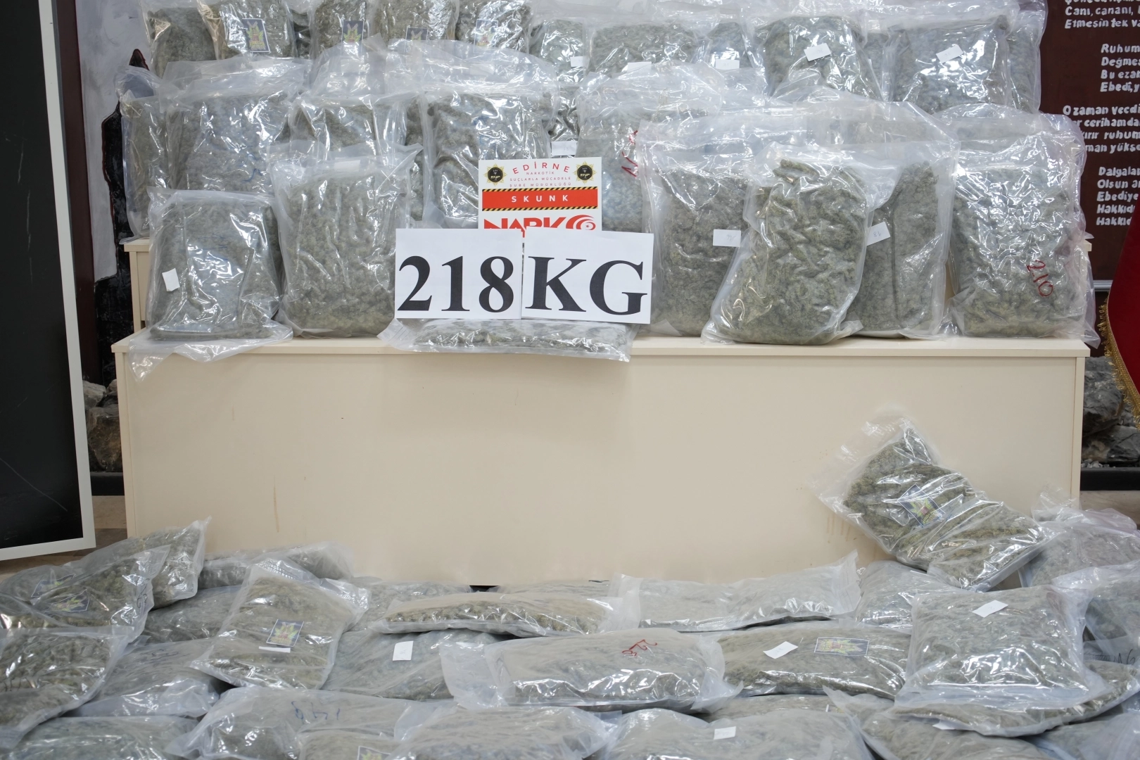 Edirne İl Emniyet Müdürlüğü’ne bağlı Narkotik Suçlarla Mücadele Şube Müdürlüğü tarafından yapılan takip sonucu Kapıkule Sınır Kapısı’nda şüpheli bir tır aracı durdurularak dedektör köpeği destekli risk analizi yapıldı. İstihbarat Şube Müdürlüğü ve Kapıkule Gümrük Müdürlüğü ile koordineli olarak yapılan uluslararası uyuşturucu madde operasyonunda risk analizi yapılan tırda toplamda 218 kilogram skunk ele geçirildi. Uluslararası zehir tacirliği yaptıkları öğrenilen Bosna Hersek uyruklu tır sürücüsü A.A. ile uyuşturucuyla sevkiyatıyla bağlantılı oldukları değerlendirilen şüpheli E.S. ve M.S. gözaltına alındı. Olayla ilgili soruşturma sürüyor.