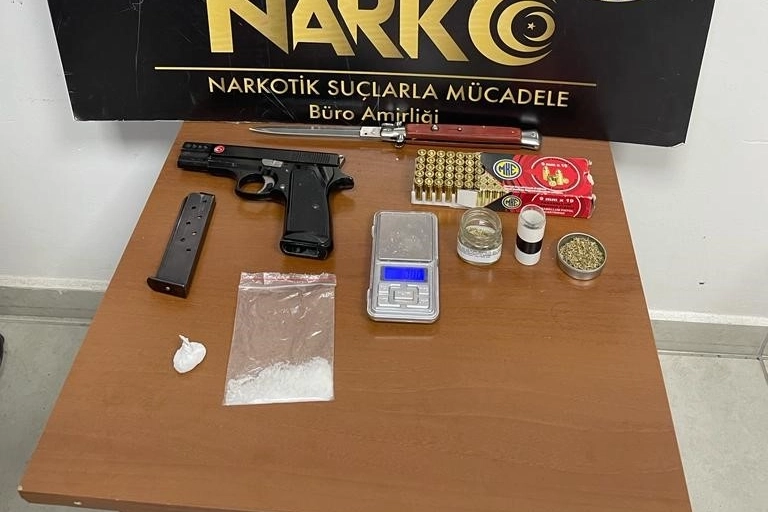 Gemlik Cumhuriyet Başsavcılığı talimatıyla Gemlik İlçe Emniyet Müdürlüğü Narkotik Suçlarla Büro Amirliği ekipleri harekete geçti. Gemlik ilçesi Umurbey Mahallesindeki A.P.'nin (43) evinin önünde bulunan araçta yapılan aramada, ruhsatsız tabanca, hassas terazi, sustalı bıçak, 6,20 gram sentetik kababinoid, 12,44 gram metanfetamin ele geçirildi.