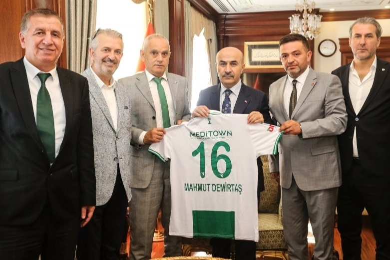 “Başkanımız Recep Günay, Yönetim Kurulu üyelerimiz; Metin Genç, Sedat Topaloğlu, Turan Cesur, Ali Rıza San ve Savaş Sefaile birlikte Bursa Valisi Mahmut Demirtaş'ı makamında ziyaret etti. Ziyaretin sonunda Başkanımız Recep Günay, Demirtaş'a isminin yazılı olduğu formamızı hediye etti.”