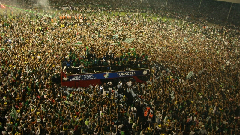 Yaşanan bu görüntüler 15 yıl önce yeşil-beyazlı ekibin Süper Lig şampiyonu olduğu günleri akıllara getirdi.Bursaspor, şampiyonluk kupasını o dönemki Türkiye Futbol Federasyonu Başkanı Mahmut Özgener'in elinden alarak üstü açık otobüsle şehir turu atmasının ardından büyük bir coşku içinde Bursa Atatürk Stadı'nda on binlerce taraftarının huzuruna çıkmıştı. Tarihinde ilk kez şampiyonluk sevinci yaşayan Bursalılar, stadı bayram yerine çevirirken, takımın gelmesiyle sahaya akın etmiş, insan selini andıran yaşanan bu görüntüleri ulusal ve yabancı basın "Timsah istilası" manşetleriyle sütunlarına taşımıştı.