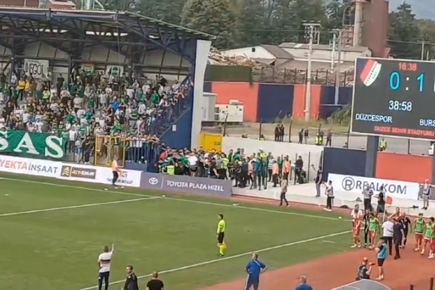 Bursaspor, Düzce deplasmanında dışarıda polis ile taraftarlar arasında yaşanan gerilim nedeniyle maç, 40. dakikada hakem tarafından durduruldu.