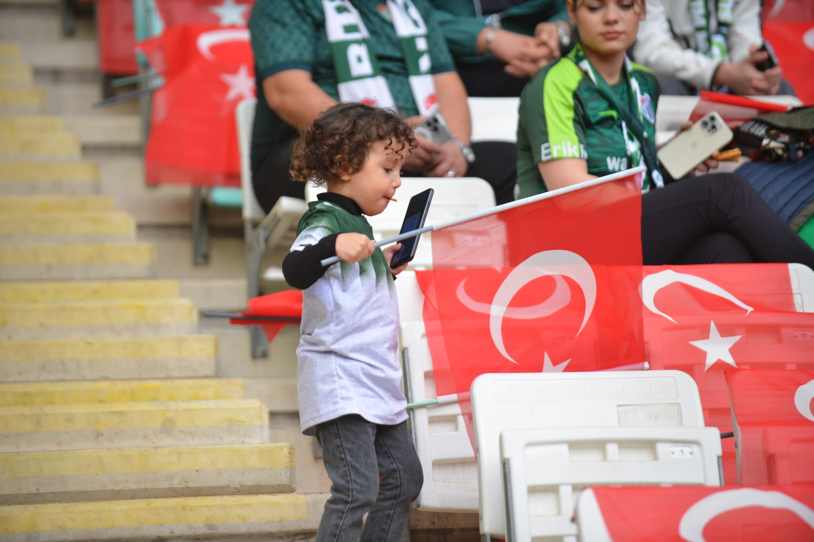 Bursaspor-Mersin İdman Yurdu maçı öncesinde kuzey kale arkası tribününde ailesi ile maça gelen bir minik taraftar, koltuklara yerleştirilen bayrağını sallarken ön sırada yere düşen bir başka bayrağın düştüğünü gördü.
