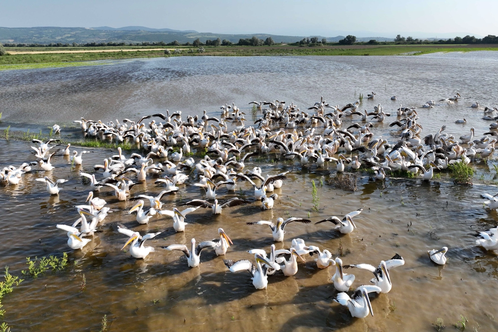 Binlerce kilometre ve günlerce süren göç yolculuğunun yorgunluğunu ve tozunu üzeri yemyeşil Nilüfer çiçekleriyle kaplı Kirmastı nehrinin genişlediği havza bölümünde banyo yaparak adeta üzerinden atan yüzlerce Ak pelikan havadan görüntülendi.