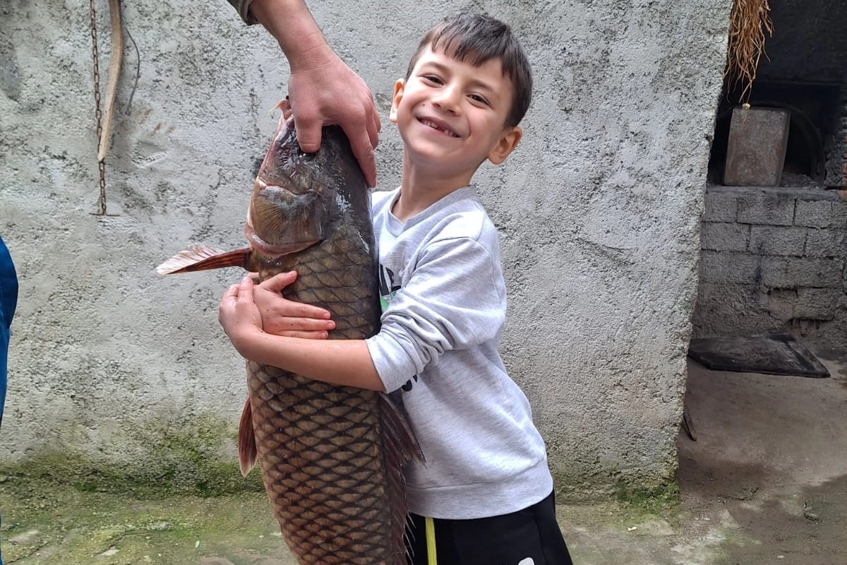 Kilosu 150 liradan satılan sarı sazanın büyüklüğü ise çocuğun balığı kucaklamasıyla ortaya çıktı.