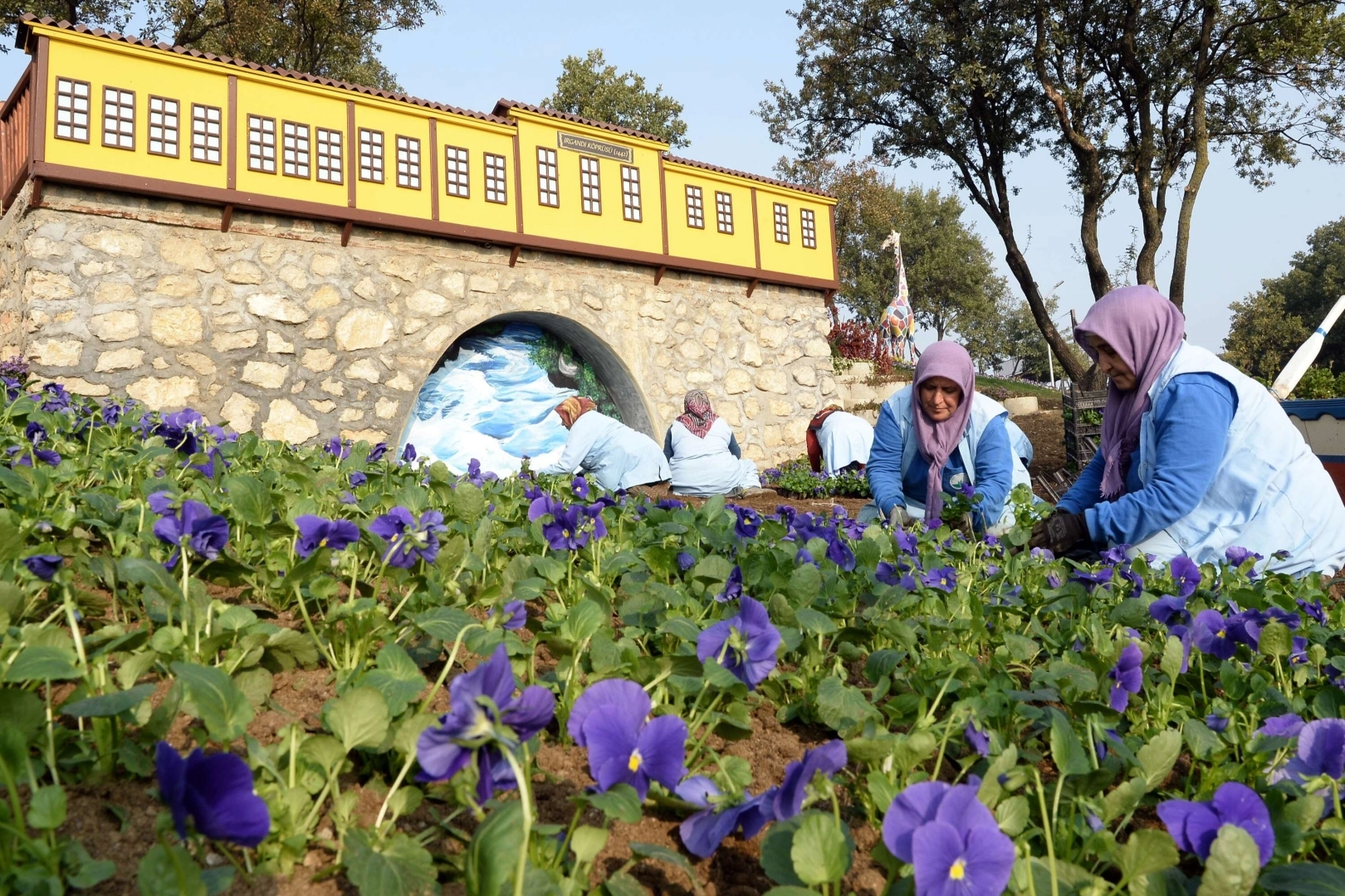 Çiçeklerin dışında, Bursa’nın simge yapılarından Irgandı Köprüsü, Somuncu Baba Fırını ile Hacivat-Karagöz, Zürafa, Sincap, Kuğu, müzik enstrümanları gibi 20 farklı figürün bulunduğu 6 bin metrekarelik tematik parkta kış çiçeklerinin ekimi yapılıyor. Osmangazi Belediyesi Park Bahçeler Müdürlüğü tarafından yürütülen çalışma ile hercai, menekşe, çuha, sıklemen, kasımpatı, süs lahanası gibi soğuk havalara dayanıklı 200 bin kış çiçeği ekiliyor. Park Bahçeler Müdürlüğü yetkilileri, 200 bin kış çiçeği dışında Mart ve Nisan aylarında açan ve soğanlı çiçekler grubuna giren 25 bin lale, nergiz ve çiğdem soğanın da ekildiğini söyledi.