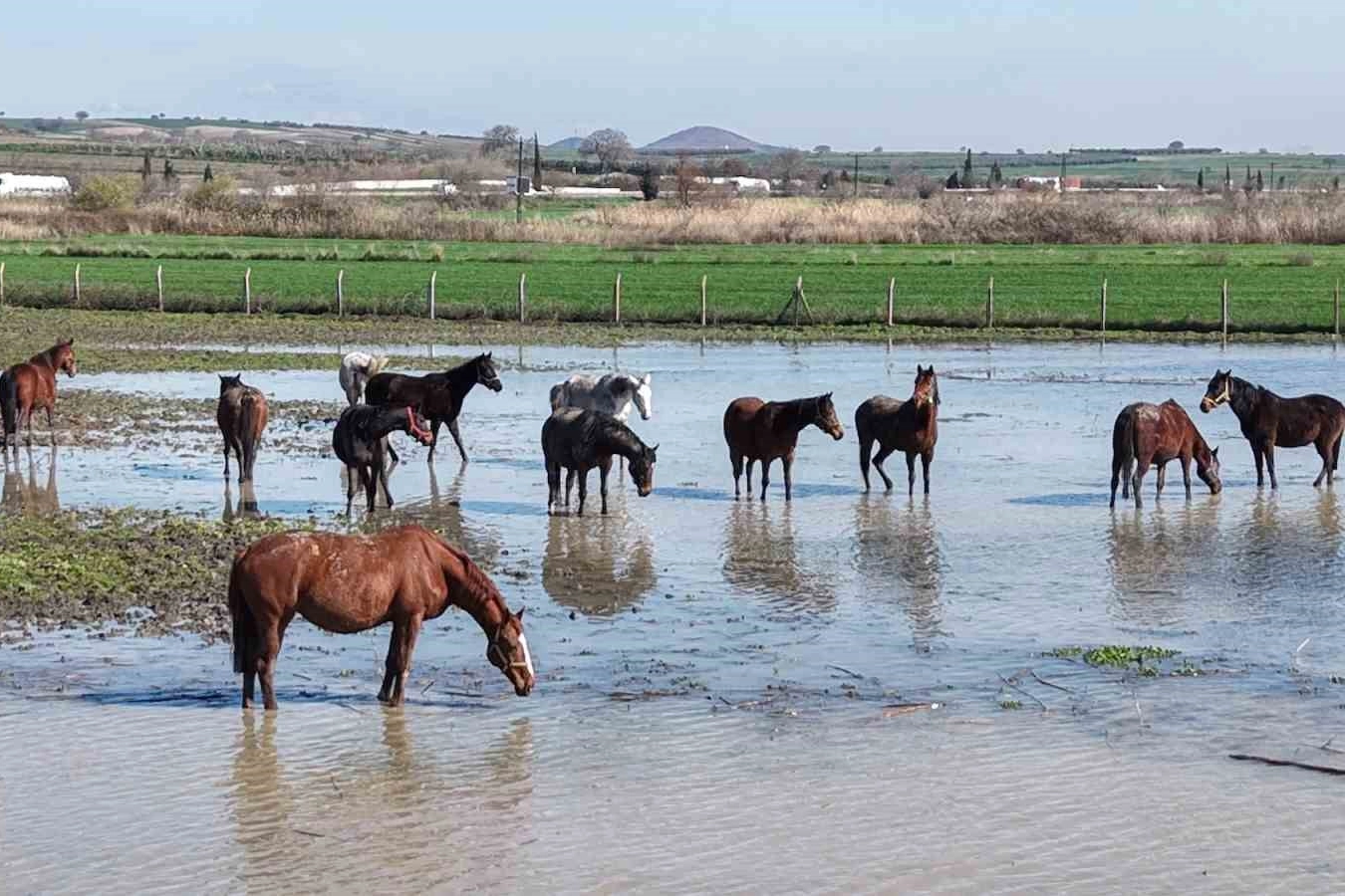 Uluabat Gölü, Bursa-İzmir kara yolunun kıyısına kadar gelirken bölgede bulunan milyonluk yarış atlarının bulunduğu tarlalar da su altında kaldı. Arap ve İngiliz yarış atları, su içinde gezinirken drone ile görüntülendi. Milyonluk tayların annesi olan damızlık atların büyük kısmının gebe olması da dikkat çekti.