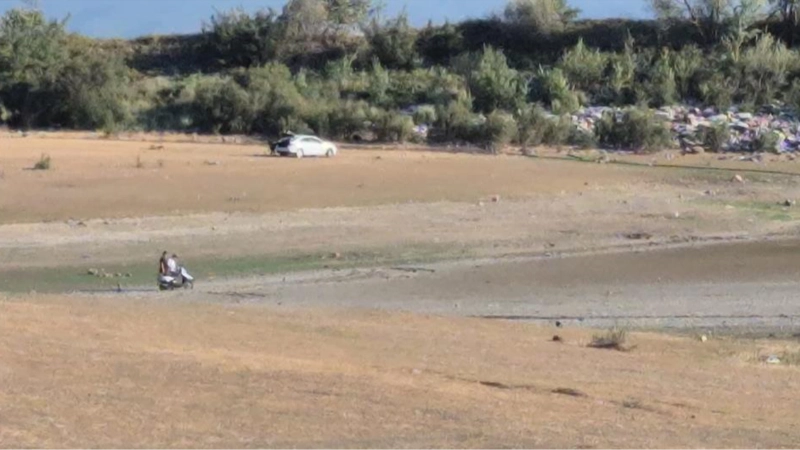 Çevre köylerdeki vatandaşlar zeytinliklerini sulamak için gölet içerisini yer yer kazarak suya ulaşmaya çalışıyor.