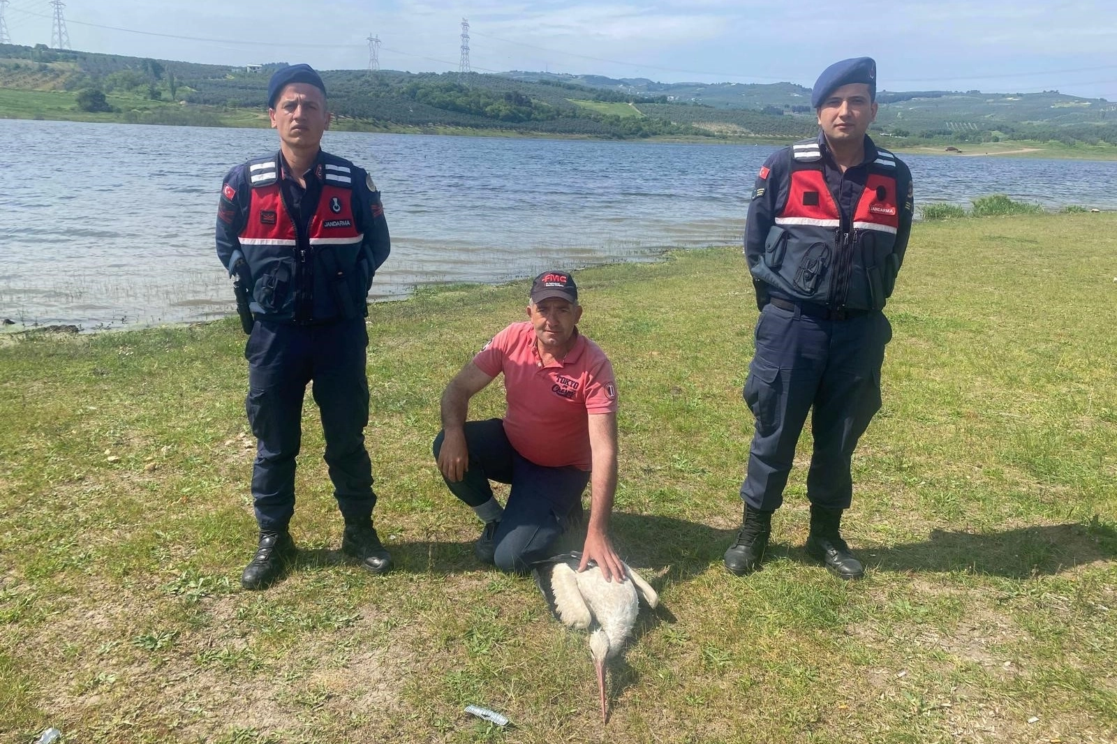 Mudanya İlçesi Hasköy Mahallesi Göleti civarında vatandaşların ‘huzur’ ve can güvenliği için devriye atan jandarma ekipleri, yol kenarında bir leyleğin uçamadığını fark etti.