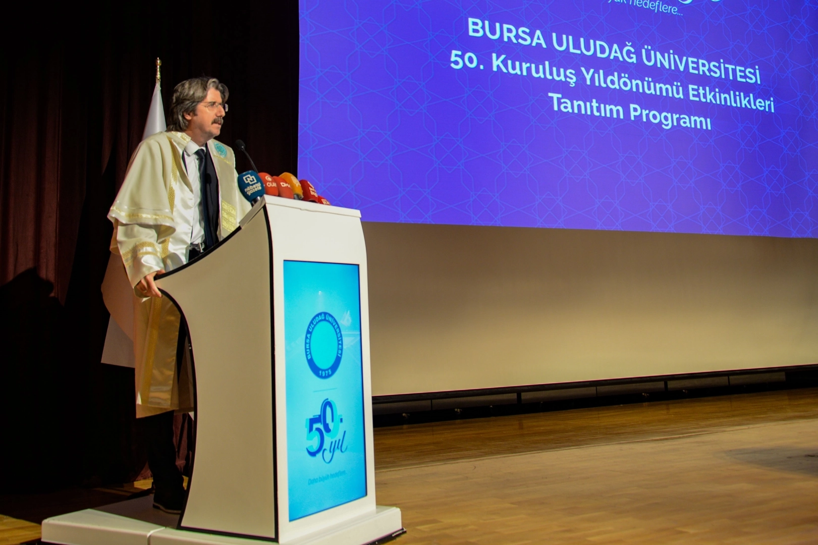'Daha büyük hedeflere' sloganıyla yürütülecek 50. kuruluş yıldönümü etkinlikleri gerçekleştirilen tanıtım programında anlatıldı. Rektör Prof. Dr. Ferudun Yılmaz, Rektör Yardımcıları Prof. Dr. Cafer Çiftçi, Prof. Dr. İrfan Kırıştıoğlu ve Prof. Dr. Zekeriyya Arı'nın hazır bulunduğu programa Üniversite Senato Üyeleri, dekanlar, müdürler, akademik ve idari personel, basın mensupları ile yüzlerce öğrenci katıldı.