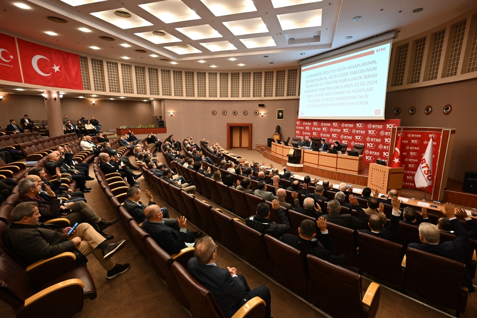 “Sürdürülebilir büyüme hedefiyle çalışacağız” BTSO Meclis Başkanı Ali Uğur, Türkiye’de ve dünyada ne yazık ki üzücü olaylarla geçen 2023 yılını geride bıraktıklarını belirterek, “İş dünyamızın daha fazla ihracat, üretim, istihdam ve yatırım yapmasını sağlayacak yapısal reformların hayata geçirilmesi büyük bir önem arz ediyor. İş dünyamızın kararlılığı ve devletimizin destekleriyle yaşanan tüm zorluklara rağmen sürdürülebilir bir büyüme hedefiyle kent ve ülke ekonomimizi ileriye taşıyacak adımları hep birlikte atacağımıza inanıyorum” ifadelerini kullandı.