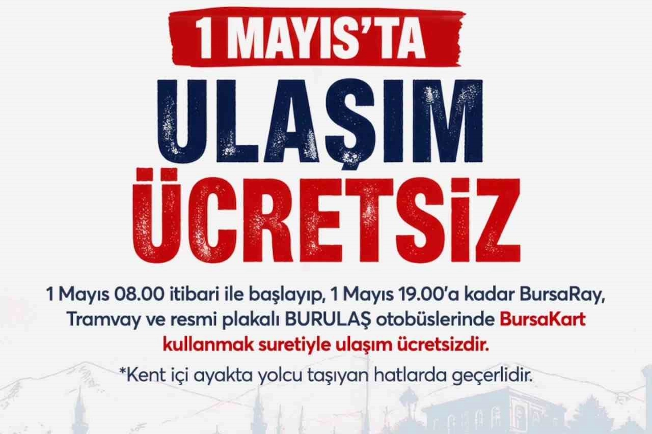 Bursa Büyükşehir Belediyesi, emeğin ve emekçinin yanında olmaya devam ediyor. 1 Mayıs Emek ve Dayanışma Günü’nde kutlama ve etkinliklerin coşkulu kalabalıklarla yapılabilmesi amacıyla BursaRay ve tramvay hatları ile resmi plakalı Burulaş otobüsleri, 1 Mayıs 2026 Cuma günü 08.00 ile 19.00 saatleri arasında BursaKart kullanmak suretiyle ücretsiz olarak hizmet verecek. Uygulama, kent içi yolcu taşıyan hatlarda geçerli olacak.