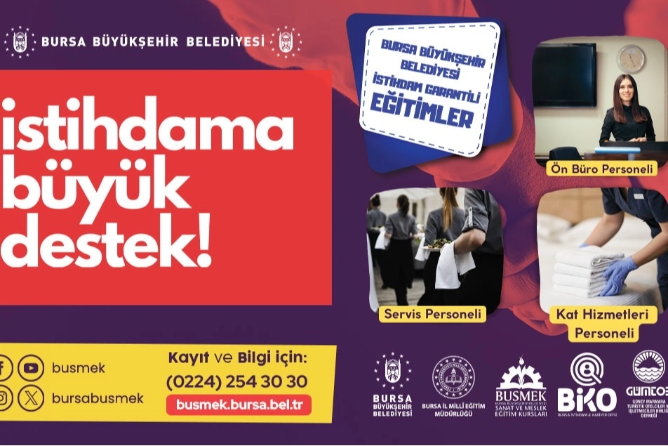 Geçtiğimiz yıl toplam 23 bin 837 kişinin sanat ve meslek eğitimlerinden ücretsiz yararlandığı BUSMEK, bunun yanında istihdam garantili kurslarla da bireyleri iş yaşamına kazandırıyor. Bu yıl mart ayında Bursa Eczacı Odası iş birliği ile düzenlenen eczacı asistanlığı kursunun ardından şimdi de BUSMEK, Bursa İstihdam ve Kariyer Ofisi (BİKO) ve Güney Marmara Turistik Otelciler ve İşletmeciler Birliği-Derneği (GÜMTOB) iş birliği ile iş garantili ön büro personeli, servis personeli ve kat hizmetleri personeli kursları düzenleniyor. Otelcilik sektöründe ihtiyaç duyulan ön büro personeli, servis personeli, kat hizmetleri personeli alanlarındaki, iş garantili eğitimler Yenikaraman Mesleki Eğitim Merkezi’nde verilecek.