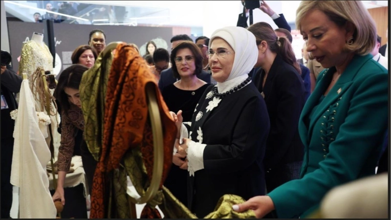 Emine Erdoğan ve beraberindeki lider eşleri, program kapsamında ilk olarak, Sanayi ve Teknoloji Bakanlığı’nın öncülüğünde hazırlanan ve Anadolu`nun binlerce yıllık bilgi, zanaat ve kültür birikimini bugünün tasarım anlayışıyla buluşturan sergiyi gezdi. Sergide, Anadolu’nun köklü kültürünü, ustalığını ve doğayla uyumlu üretim geleneklerini tasarım ve yenilikle buluşturan eşsiz eserler yer aldı. Bu özel koleksiyonun dikkat çeken parçaları arasında Bursa’nın dünyaca ünlü ipeği de öne çıktı.