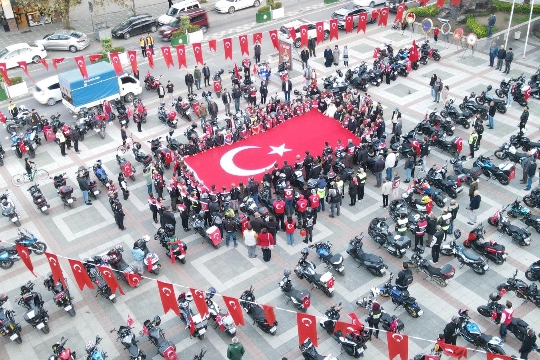 Orhangazi’de akşam saatlerinde toplanan 150 motosikletçi Cumhuriyet Alanında bir araya geldiler. Orhangazi Motosiklet Kulübü, Yeşil Bursa Motosiklet Kulübü, Tüm Emekçi Motosikletli Kuryerle Derneği (TEMKUD), Gezginler Motosiklet Kulübü, İnegöl Motosiklet Kulübü, Moto TİM, Fatih Motosiklet Kulübü üyesi 150 motosiklet ve 200’e yakın motosiklet tutkunu, Cumhuriyet Alanında dev Türk bayrağı açtı. Saygı duruşunda bulunan ve İstiklal Marşı okuyan 150 motosiklet Türk bayrakları ve marşlar eşliğinde Orhangazi ilçe merkezinde şehir turu atarak Cumhuriyet’in 101. yıldönümü kutladı. Gemlik Belediye Başkanı da katıldı