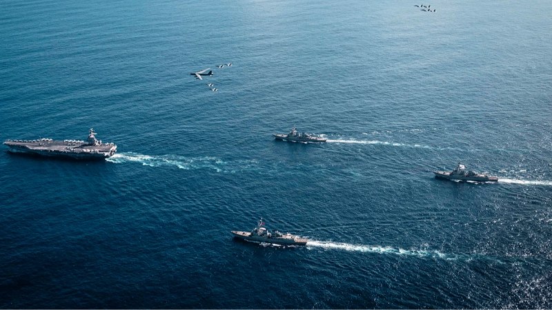 USS Gerald R. Ford liderliğindeki taarruz filosunun 4 binden fazla askeri personel ile düzinelerce taktik askeri uçağı taşıdığı kaydedilerek, "Kendi sınıfının ilk uçak gemisi olan USS Gerald R. Ford, gündüz-gece fark etmeksizin sabit kanatlı uçakların iniş ve kalkışına aynı anda imkan tanıyarak katıldığı operasyonları kesintisiz şekilde destekleyebilmektedir" hatırlatmasında bulunuldu. USS Gerald R. Ford uçak gemisinin yanı sıra, Arleigh Burke sınıfı güdümlü füze destroyerleri USS Bainbridge ve USS Mahan ile entegre hava ve füze savunma komuta gemisi USS Winston S. Churchill dahil çok sayıda askeri varlığın bölgeye konuşlandırıldığı vurgulandı."ABD ordusu ulusötesi tehditler ile mücadeleye hazır"