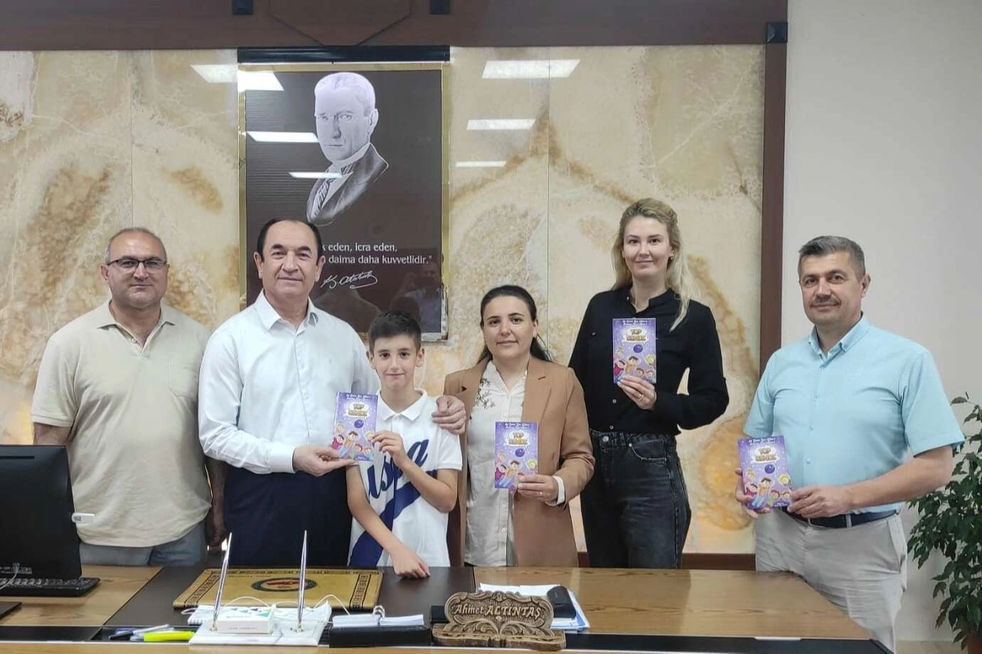 Yazarlığa ilk adımını ‘Top Sende’ kitabıyla atan Ali Eymen Şen, annesi Ayşenur Şen ile birlikte sevincini Kaymakam Ahmet Altıntaş ve Milli Eğitim Müdürü Veysel Çalık’ı ziyaret ederek paylaştı.