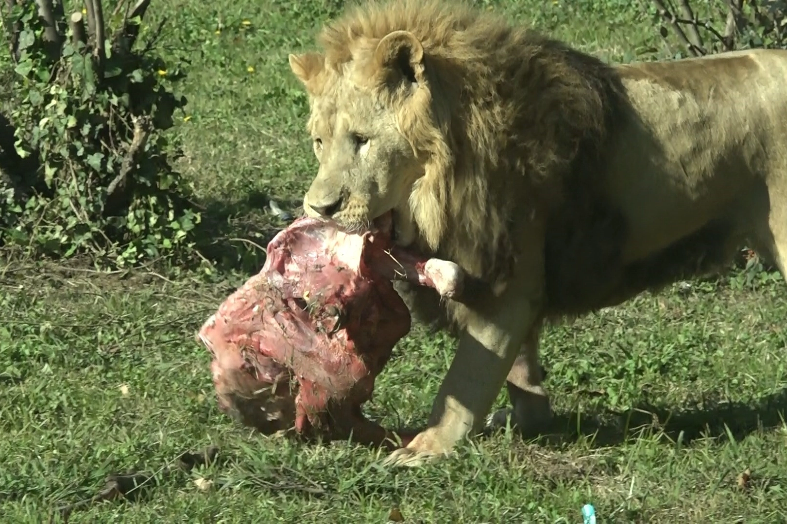 Bursa Büyükşehir Belediyesi'ne ait hayvanat bahçesinde aslanların bakıcıları tarafından bırakılan karkas olarak bırakılan yaklaşık 50 kiloluk eti, iştahla midelerine indirdi. Yaklaşık 206 bin metrekarelik bir saha üzerine kurulu bulunan Bursa Hayvanat Bahçesi'nde bir aslanın günde ortalama 5-6 kilogram et yediğini belirten yetkililer, günün bir kısmını dinlenerek geçiren bu vahşi kedilerin beslenme ve davranış zenginleştirme programına tabi tutulduğunu söyledi. Tabiatta zamanlarının büyük bir kısmını yiyecek bulmak, yuva yapmak ve kendi hakimiyet alanlarını korumak için geçiren aslanların hayvanat bahçesinde veteriner, biyolog ve yetkililer tarafından kalorileri tek tek hesaplanan gıdalarla beslenirken, vatandaşlarla onları ilgiyle izledi.