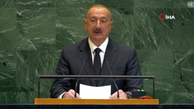 Azerbaycan Cumhurbaşkanı İlham Aliyev, 80. BM Genel Kurulu’na katılmak üzere ABD’nin New York şehrinde geldi. Aliyev, BM Genel Kurulu’ndaki konuşmasında, uzun yıllar boyunca kürsüde Azerbaycan’a karşı işlenmiş saldırı, işgal ve adaletsizlik faciaları hakkında konuştuğunu hatırlattı. Ancak bugün ise Azerbaycan’ı zafer ve barışa götüren uzun yoldan ve Azerbaycan tarihindeki yeni dönemden bahsedeceğini belirten Aliyev, "Yaklaşık 30 yıl boyunca Azerbaycan’ın egemen topraklarının yaklaşık yüzde 20’si Ermenistan’ın askeri işgali altında kaldı. Ermenistan’ın yürüttüğü etnik temizlik siyaseti ve savaş suçları sonucunda 1 milyon Azerbaycanlı kendi yuvasından sürgün edildi. Onların temel insan hakları ağır şekilde ihlal edildi. BM Güvenlik Konseyi’nin 1993’te kabul ettiği dört kararda Ermenistan Silahlı Kuvvetleri’nin işgal altındaki topraklardan derhal, tam ve şartsız çekilmesi talep edildi. Ne yazık ki bu kararlar hiçbir zaman uygulanmadı. Ermenistan, uluslararası toplum tarafından hiçbir yaptırıma maruz kalmadığı için kararlara alenen uymadı. 1992’de çatışmayı çözmek için kurulan Avrupa Güvenlik ve İşbirliği Teşkilatı (AGİT) Minsk Grubu ise misyonunu yerine getiremedi. AGİT Eşbaşkanları, uluslararası hukuk norm ve ilkelerini uygulamak yerine statükoyu korumaya ve çatışmayı dondurmaya çalıştılar. 2020’de, 30 yıla yakın süren sonuçsuz müzakerelerden sonra Azerbaycan, BM Şartı’nın 51’nci maddesine uygun olarak meşru müdafaa hakkını kullanmaya mecbur kaldı. Ermenistan savaş sırasında şehirlerimize ve köylerimize balistik füzeler attı, kaset bombalarıyla bombaladı, yüzden fazla masum sivil vatandaşımızı katletti" dedi.