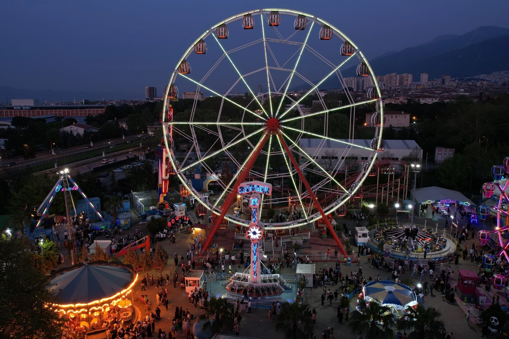 Ramazan Bayramı’nı Bursa’da geçiren aileler Kültürpark’a akın etti. Dönme dolaptan, gondola, çarpışan arabalardan atlıkarıncaya binen çocuklar bayramda gönüllerince eğlendi. Adrenalin tutkunu yetişkinler ise bindikleri oyuncaklarda çığlıklar atarak o anların heyecanını yaşadı. 7’den 70’e her kesimden insanın akın ettiği lunaparkın renk cümbüşü havadan da görüntülendi. Bayram harçlıklarını alan çocuklar ve aileleri gecenin ilerleyen saatlerine kadar ışıltılı dünyada doyasıya eğlendi.