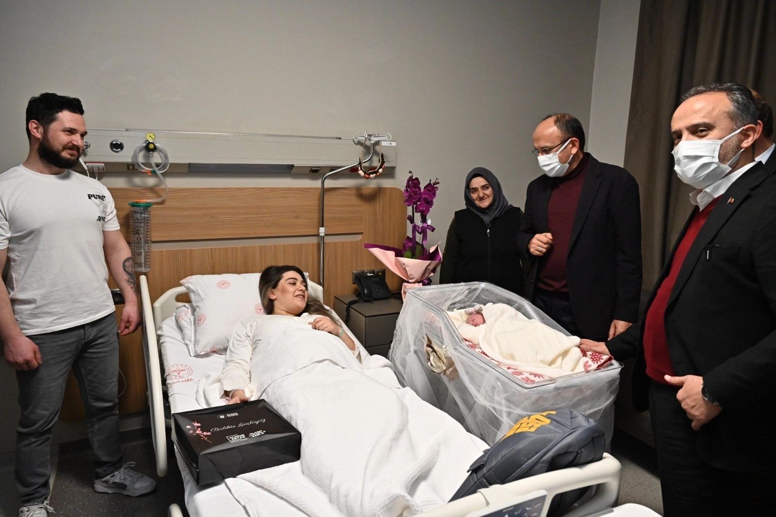 Başkan Alinur Aktaş, 2023'ün son ve 2024'ün ilk ziyaretini ise Bursa Şehir Hastanesi’ne yaptı. Başkan Aktaş ve beraberindeki Bursa Milletvekili Mustafa Yavuz, Başhekim yardımcısı Dr. Özlem Avcı, Sağlık Bakım Hizmetleri Müdürvekili Özlem Kavak ile birlikte hastane personeline çiçek ve çeşitli hediyeler verdi. Başkan Aktaş, bebekleri 2023 yılının doğan son bebeği olarak kayıtlara geçen Tuğba ve Şevket Sarı çiftini ziyaret etti. Çocuklarına Ali Asaf ismini veren Sarı çiftine çiçek ve bebek seti hediye edilirken, Başkan Aktaş minik bebeğe de altın taktı.