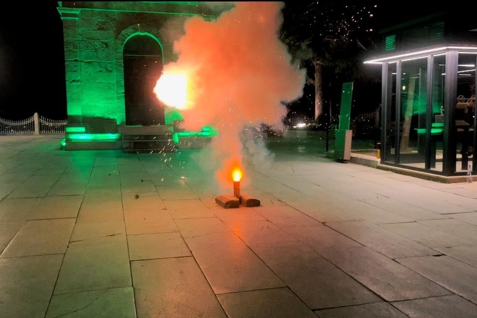 Top atışında kullanılan bezlerin çevre kirliliğine yol açması, ses bombasının daha pratik ve kullanışlı olması nedeniyle bir süre önce bu uygulamaya geçen Bursa Büyükşehir İtfaiye ekipleri, sahur ve iftar saatinde Tophane’de bulunan saat kulesi yanından ses bombasını kontrollü bir şekilde patlatıyor.