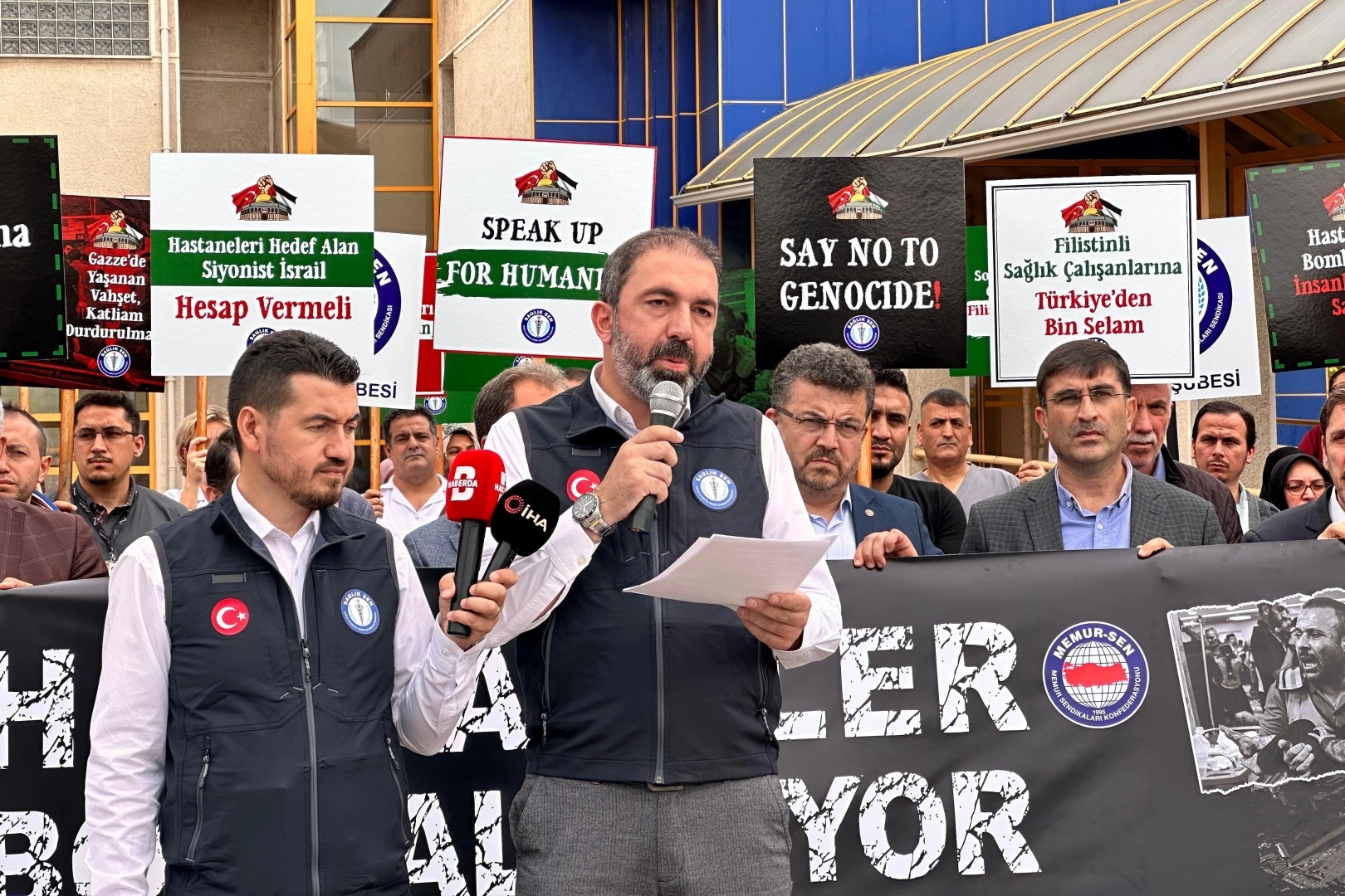 “Kudüs'e, Gazze'ye, Filistin'e selam olsun” Sağlık-Sen Bursa Şubesi Başkanı Gökhan Yünkül yaptığı açıklamada, “İlk kıblemiz Mescid-i Aksa için, Kudüs için, bombardıman altındaki Gazze için buradayız. Vurulan, yıkılan hastanelerdeki bebekler için, şehit olan sağlık çalışanları için buradayız. Gözü yaşlı analar, bağrı yanık babalar için, süt kokulu bebekler için, vicdanların sesi olmak için buradayız. Sağlık-Sen teşkilatları olarak, Türkiye’nin 81 ilinden, hastanelerimizden sesleniyoruz. Kana doymayan, işgalci, katil, Siyonist İsrail’i lanetlemek, mazlum Filistin halkının haklı davasına destek vermek için buradayız. Kudüs’e selam olsun. Gazze’ye ve Filistin halkının haklı mücadelesine selam olsun” dedi.