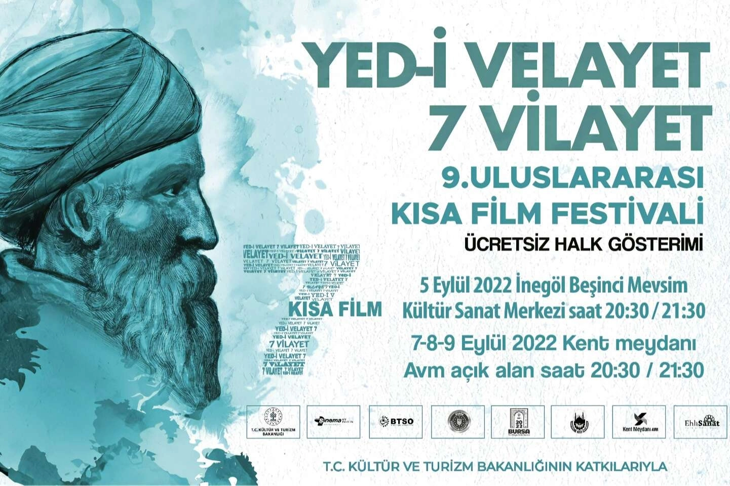 Kültür ve Turizm Bakanlığı Sinema Genel Müdürlüğü ve Bursa Ticaret ve Sanayi Odası destekleriyle Ehli Sanat Sinema ve Kültür Derneği tarafından bu yıl 9. kez düzenlenen “Yed-i Velayet 7 Vilayet” Kısa Film Festivalinin ücretsiz halk gösterimleri başlıyor.