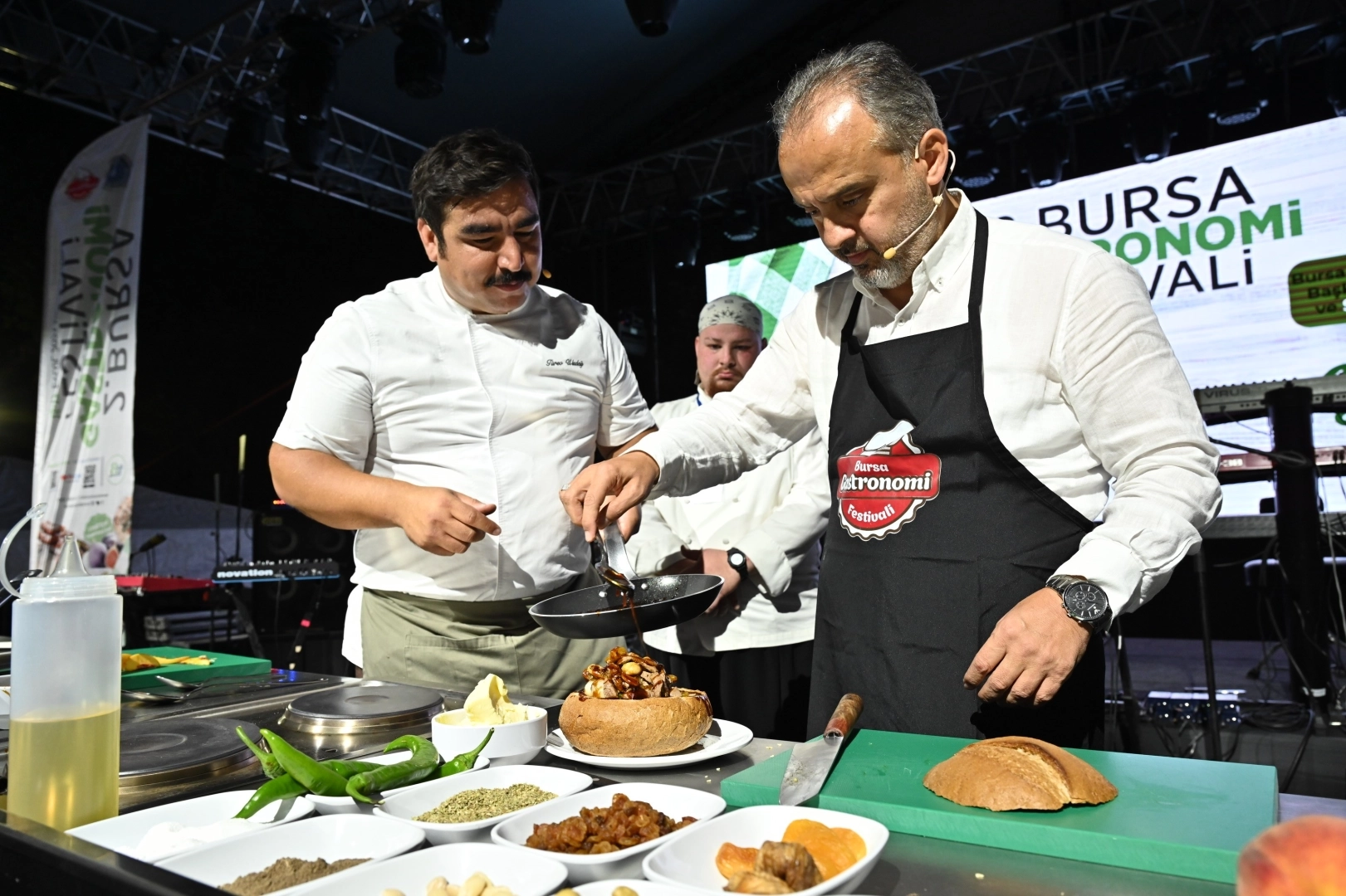 Bursa’nın gastronomi kültürünü ortaya çıkarmak amacıyla zengin içerikle hazırlanan 2. Bursa Gastronomi Festivali, gündüz yaşanan yoğunluğun yanında gece de ayrı bir coşkuyla devam etti. Gün boyu alandaki stantlarda hazırlanan tescilli lezzetlerin tadına bakma imkanı bulan katılımcılar, gece ise Büyükşehir Belediye Başkanı Alinur Aktaş’ın mutfaktaki hünerlerini izledi. Alana kurulan ana sahnede Şef Türev Uludağ’ın ‘Bir yemek olsam’ programına konuk olan Başkan Aktaş, mutfak önlüğünü takım, tezgahtaki ürünleri kullanarak orijinal bir yemek hazırladı. Tezgahtaki badem, kestane, incir, kayısı, kuru üzüm, kekik, tuz, şeftali, soğan, biber gibi ürünlerle nasıl bir yemek çıkacağını kendisi de kestiremeyen Başkan Aktaş, Şef Uludağ’ın yönlendirmesiyle önce tüm ürünleri doğrayarak işe başladı. Mutfakta fazla becerikli olmadığını dile getiren Başkan Aktaş, tavada sotelenerek hazırlanan yemeği, bir ekmek içine doldurarak, üzerini sosladıktan sonra önce tadına baktı, ardından alanı dolduran vatandaşlara da kendi elleriyle ikram etti.