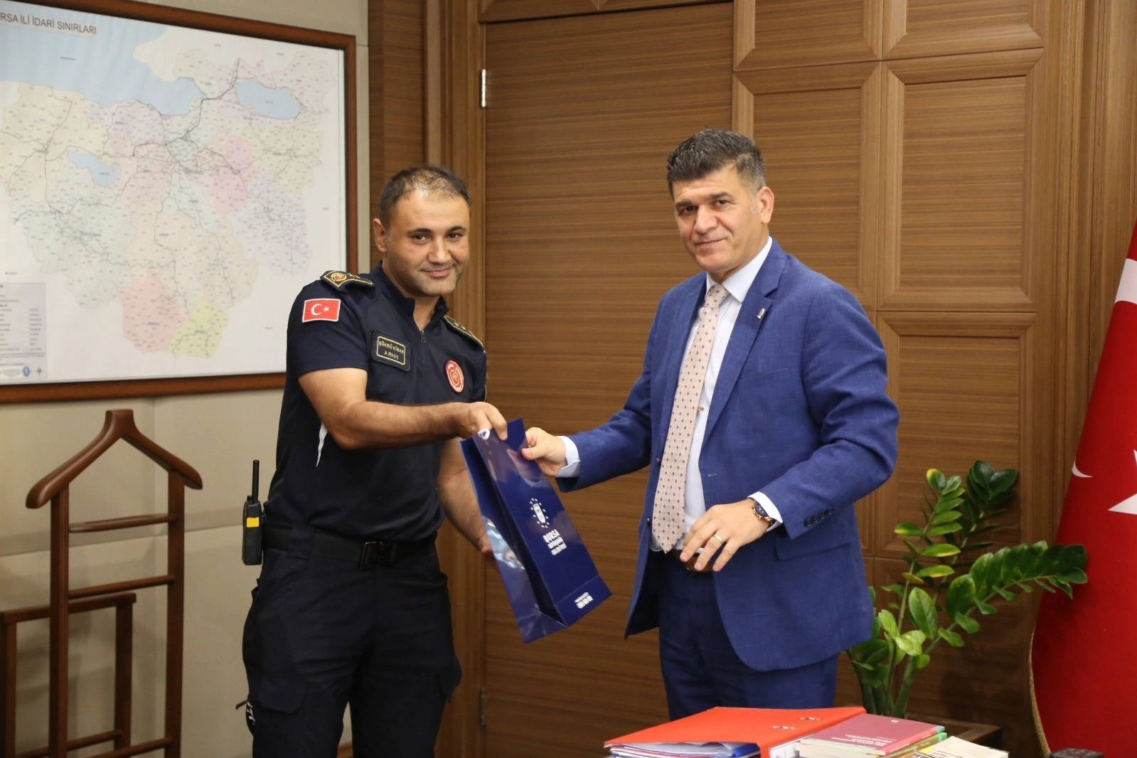 Ziyaretin sonunda Genel Sekreter Halisçelik tarafından kahraman itfaiye personeline hediye takdim edildi.