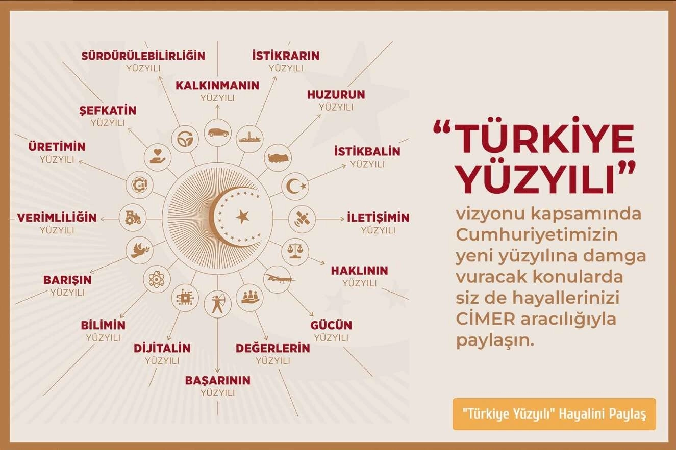 Cumhurbaşkanlığı İletişim Merkezi CİMER, Cumhurbaşkanı Erdoğan'ın geçen hafta açıkladığı Türkiye Yüzyılı vizyon projesine ilişlkin görüş ve önerileri alacak.