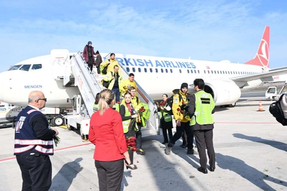 Kahramanmaraş'ta meydana gelen iki büyük depremin ardından bölgede arama kurtarma çalışmaları devam ederken, diğer yandan çalışmalara katılmak için birçok ülkeden gelen arama kurtarma ekiplerinin çalışmalarını tamamlamasının ardından ülkelerine dönüşü sürüyor. Almanya'dan deprem bölgesine gelen arama kurtarma ekipleri çalışmalarını tamamlayarak Türk Hava Yollarına (THY) ait tahliye uçağıyla bugün Kahramanmaraş'tan İstanbul'a geldi. Ekipler, THY ve yer işletme hizmet şirketi Turkish Ground Services (TGS) çalışanları tarafından çiçeklerle karşılandı. Alman ekip THY'nin tarifeli uçağıyla bugün ülkesine dönecek.