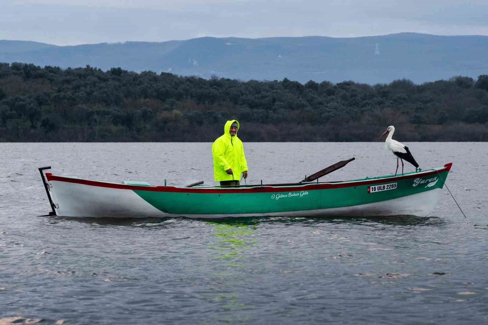 Yaren Leylek, 15. yılında da Karacabey’de balıkçı Adem Yılmaz’ın kayığına konarak dostluğu bir kez daha tazeledi.