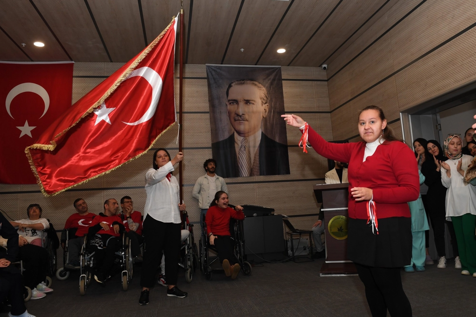 Osmangazi Belediyesi Engelliler Bakım Merkezi (OBAM)’da eğitim gören özel ihtiyaç sahibi bireyler, TUSAŞ’a düzenlenen hain terör saldırı nedeniyle erteledikleri 29 Ekim Cumhuriyet Bayramı kutlama programını gecikmeli de olsa gerçekleştirmenin mutluluğunu ve gururunu yaşadı. Cumhuriyetin 101’inci yılını, söyledikleri marşlar ve hazırladıkları koreografi ile kutlayan engelli bireyler, daha sonra üzerinde Atatürk’ün fotoğraflarının yer aldığı siyah pelerinleri giyerek ölümünün 86’ıncı yılında Atalarını saygı, minnet ve özlem ile andı.