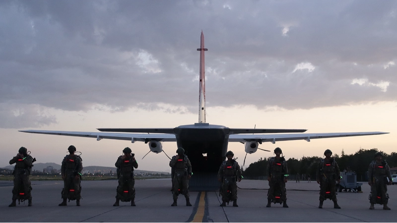 Kıbrıs Barış Harekatı’nda görev icra eden ve sancağında 2 üstün cesaret ve feragat madalyası olan Kayseri 1. Komando Tugayı tarafından düzenlenen Erciyes-2025 Tatbikatı’nın seçkin gözlemci günü gece atlayışı ile başladı. Konvansiyonel, konvansiyonel olmayan ve hibrit harekat ortamında müşterek hava indirme yeteneğini kazanmak, kuvvet sevki ve derhal müdahale yeteneklerini geliştirmek, dost ve müttefik ülkelerle birleşik harekat icra etme kabiliyetini artırmak amacıyla düzenlenen tatbikat kapsamında, 12. Hava Ulaştırma Ana Üs Komutanlığı’nda büyük bir özveriyle hazırlıklarını tamamlayan paraşütçü komandolar havalanan C-130 nakliye uçağından hava kılavuz harekatını gerçekleştirmek için gece atlayışı yaptı. Yarın 265 paraşütçü komandonun atlayış yapacağı yere inen komandolar, bölgenin emniyetini alacak.