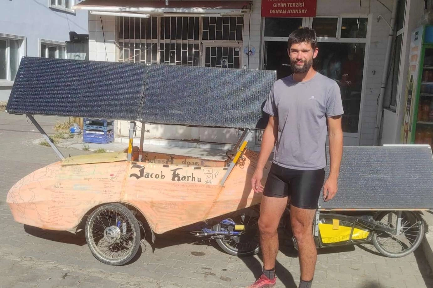 Fransa’nın Paris şehrinde yaşayan Fas asıllı Jacob Karhu, kendi yapımı olan ve tamamen güneş enerjisiyle çalışan ilginç aracıyla binlerce kilometre yolu aşarak İstanbul’a geldi. İstanbul’da bir süre gezen Karhu, geri dönüş yolunda Kırklareli’nin Vize ilçesine bağlı Sergen köyünde mola verdi. Paris Üniversitesi İklim ve Çevre Bilimleri alanında Çevre ve İklim Değişikliği üzerine doktora eğitime devam eden Karhu, iklim değişikliğine dikkat çekmek ve çevreci araçların önemini göstermek amacıyla tamamen kendi yapımı olan, güneş enerji panelleriyle enerjisini güneşten alan aracıyla Paris’ten yola çıkarak İstanbul’a geldi. Panellerin yetersiz kaldığı durumda pedallarını kullandığı aracıyla seyahat eden Karhu, İstanbul’a hayran kaldığını belirterek misafirperverlikleri için Türk halkına teşekkür etti.