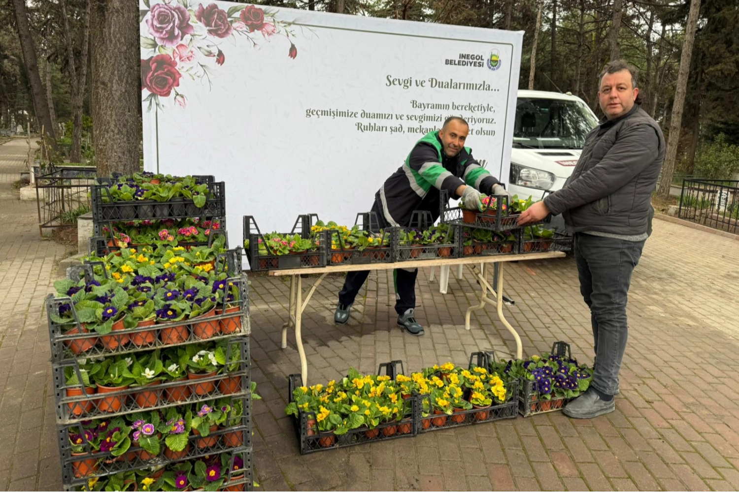 İnegöl Belediyesi, Ramazan Bayramı arifesinde mezarlık ziyaretine gelen vatandaşlara ücretsiz 9 bin adet çiçek dağıtarak anlamlı bir uygulamayı bu yıl da sürdürdü.