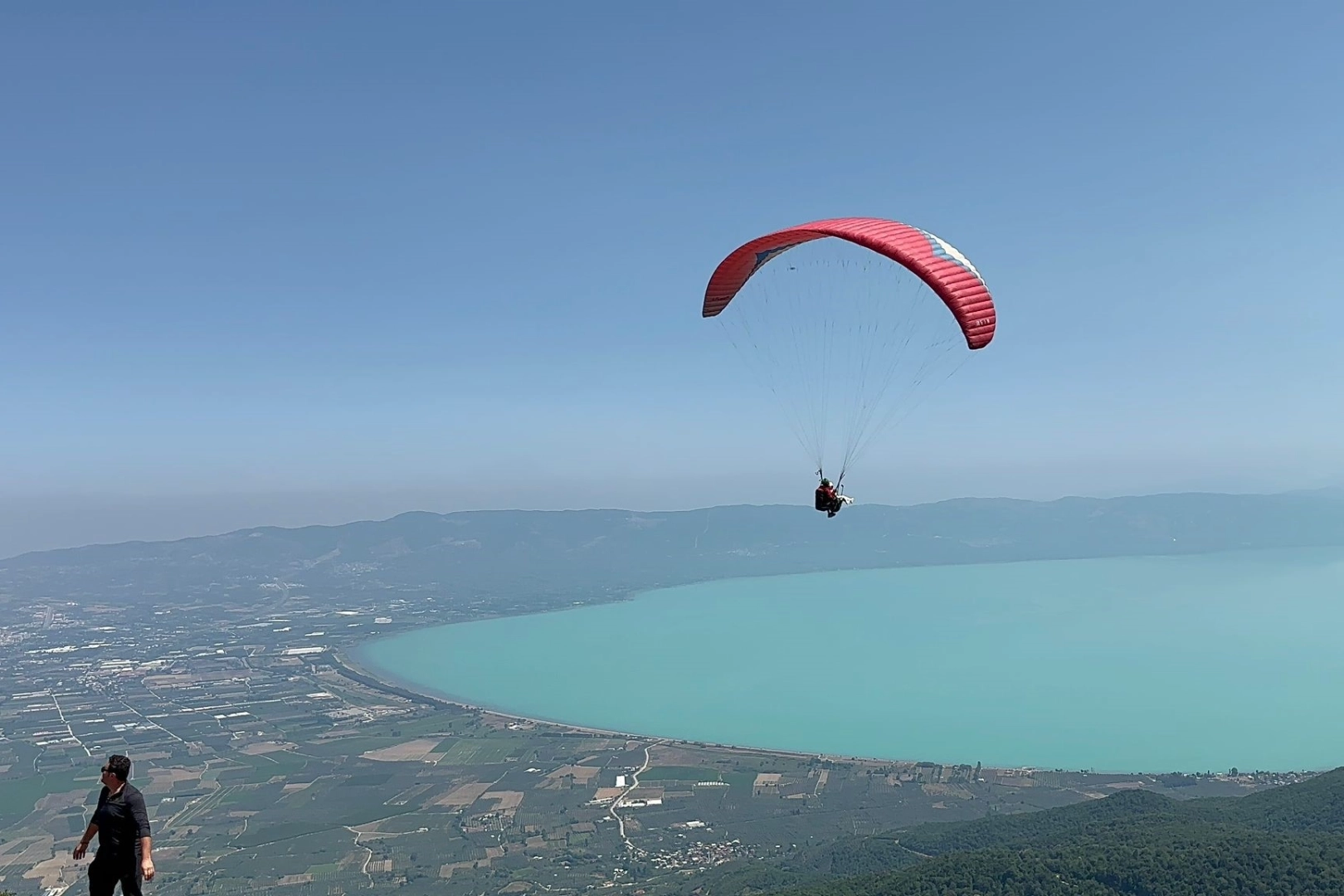 İznik Gölü'nde yamaç paraşütü etkinliğini başlatan profesyonel yamaç paraşütçüsü Şahin Yılmaz, “Taleplere yetişmekte zorlanıyoruz. Bursa Orhangazi Gölyaka Gürle Dağı'nda 1160 metre yükseklikteyiz. Buradan İznik Gölü'nün turkuaz rengini tepeden paraşütle geçeceğiz” diye konuştu.