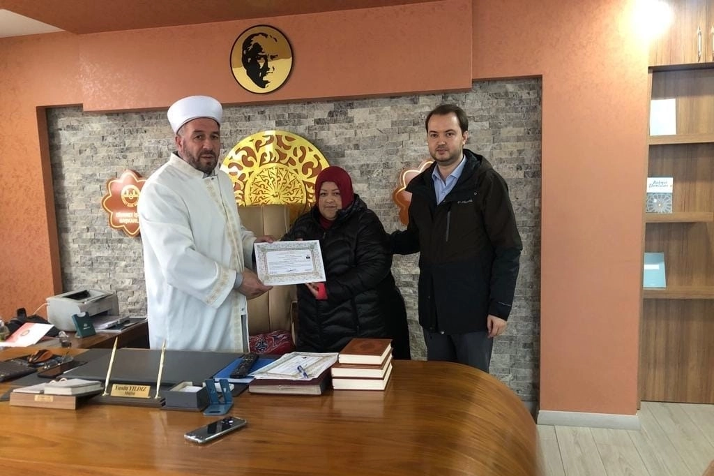 İlçe Müftüsü Yasin Yıldız tarafından İhtida belgesi ile Kuran-ı Kerim hediye edildi.