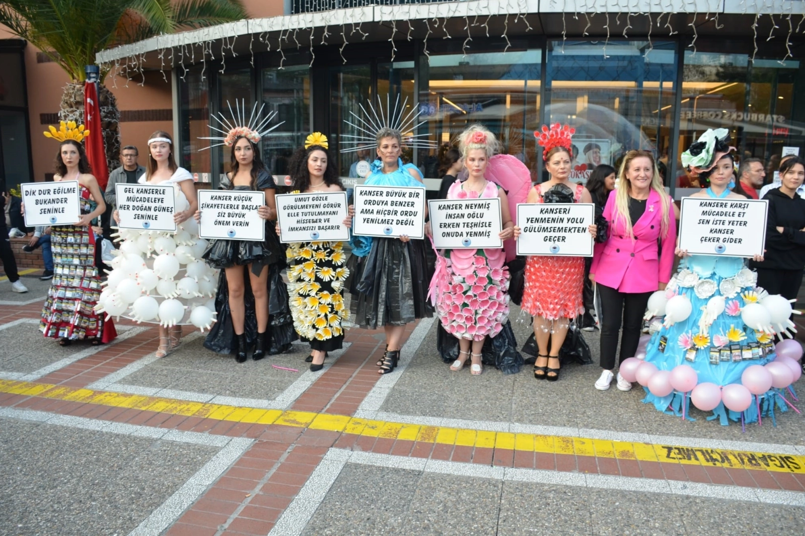 Bursa Kanser Derneği tarafından düzenlenen defilede, kanserojen etkisi bulunan atık maddelerden yapılan giysiler kanser hastası kadınlar ve yakınları tarafından tasarlanıp sergilendi. Sigara paketleri, lateks eldiven, çöp poşeti, plastik ve kağıt çatal kaşık ile tabaklardan tasarlanan elbiseler defilede en büyük ilgiyi gören kostümler oldu. Dernek Başkanı Aysun Arslan, "Kanser hastalığı toplum için büyük bir yaradır. Toplumumuzun vebası. Hayatımızda birçok insanın hikayesine nispeten şahitlik edebiliyoruz. Taramalarımızın, kontrollerimizin yapılması çok kıymetli. Bizlerin üzerine düşen sosyal sorumluluk projelerimiz de halkı taramalara davet edebilmek. Onların hayatında bir kişiye dahi dokunabiliyorsak çok kıymetli" diye konuştu.