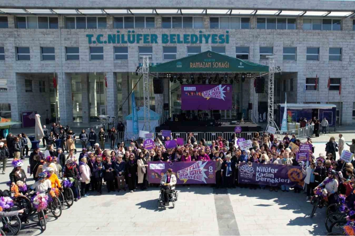 Nilüfer Belediyesi ve Nilüfer Kent Konseyi, 8 Mart Dünya Kadınlar Günü’nde geniş katılımlı bir yürüyüş ve basın açıklaması düzenledi. "Eşitlik Ses İster, Biz Buradayız" sloganıyla Nilüfer Kent Konseyi önünde başlayan yürüyüşte kadınlar, eşitlik ve direniş sloganları eşliğinde Nilüfer Belediyesi Halk Evi önündeki Cumhuriyet Meydanı’na kadar yürüdü. Etkinliğe, Nilüfer Belediye Başkan Yardımcıları Serpil Altun ve Bukle Erman ve meclis üyeleri ile Nilüfer Belediye Başkanı Şadi Özdemir’in eşi Nuray Özdemir de katıldı. Korteje, Nilüfer Kent Konseyi Bisiklet Çalışma Grubu da bisikletleriyle eşlik etti.