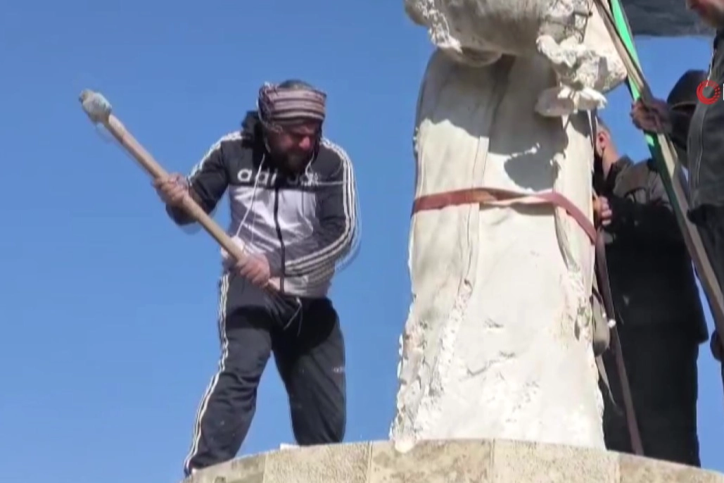 Suriye’nin terör örgütlerinden temizlenen kenti Rakka’da, PKK/YPG'nin Suriye uzantısı Suriye Demokratik Güçleri’ne (SDG) ait heykeller iş makineleri ve balyozlarla yıkıldı.