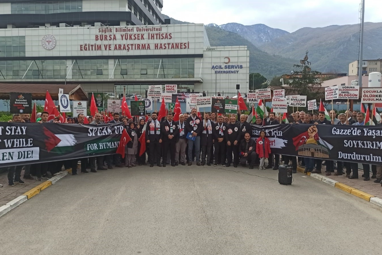 Bursa Gönüllü Kuruluşlar Platformu, sağlık çalışanlarıyla birlikte Yüksek İhtisas Eğitim ve Araştırma hastanesi önünde İsrail'in Filistin halkına ve sağlık çalışanlarına karşı yaptığı soykırımı protesto etti. Siyah önlüklerini giyen sağlık çalışanları, ellerindeki dövizlerle biran önce savaşın durmasını istedi. Platform adına konuşan Sağlık-Sen Bursa Şube Başkanı Gökhan Yünkül, "Sağlık çalışanlarımızı temsil eden beyaz önlüklerimizi çıkardık. Siyah önlüklerimizi giydik. Gazze’de artık beyaz önlüğün anlamı kalmadı. Kanla lekelenerek kızıla boyanan önlükler yıkılan enkazların tozu toprağıyla siyaha döndü. Bizlerde hayatını kaybeden Gazzeli sağlık çalışanlarımız için siyah önlükler ile meydanlarda onların yanında olduğumuzu haykırıyoruz. 45 gündür, insanlığın rafa kaldırıldığı, hiçbir ayrım gözetilmeksizin bebek, çocuk, genç, yaşlı, kadınların dünyanın gözü önünde canlı yayınlarla soykırıma tabi tutulduğu bir vahşeti seyretmekteyiz ve şahit olmaktayız. Bizlerin seyretmeye dayanamadığı bu görüntüleri Filistinliler bizzat yaşamaktadır" dedi. Ortada hastane kalmadığı için sokaklarda sağlık hizmeti vermeye çalışan bir avuç sağlık çalışanı belki de dünyanın en zor şartlarında bu işi yapmakta olduğunu ifade eden Yünkül, "Sağlık malzemesi olmadan ellerinde kalan ne varsa onunla sağlık hizmeti vermeye çalışan Gazzeli sağlık çalışanı kahramanları Bursa’daki sağlık çalışanları olarak selamlıyoruz. Uluslararası hukukun, savaş hukukunun, uluslararası ceza hukuk kurallarının ve insan haklarının yok sayıldığı bir tabloda inisiyatif sahibi olacak merciler ve Devletler bu vahşetin önüne geçmek yerine, bunu teşvik edecek açıklamalar, tavırlar sergilemekte ve bu soykırımın ortağı olmaktadırlar. Terör devleti İsrail’in hayasızca saldırılarının başladığı 45 gündür 17 bin 500 insan katledildi. Bunların 7 bine yakınını çocuklar oluşturmaktadır. Evet, BM Genel Kurulunda 1989 yılında imzalanan Çocuk Haklarına Dair Sözleşme ile birlikte tüm dünyada 21 Kasımda Dünya Çocuk Hakları Günü kutlanıyor ve bu sene de kutlandı. Böylesi bir günü ihdas eden BM ve alt kuruluşları 45 gündür saatte 5 çocuğun öldürüldüğü, dünyada en kısa sürede en çok çocuğun katledildiği Gazze’de yaşanan soykırımı basit üzüntü ve eleştiri açıklamaları ile geçiştirdiler" diye konuştu. Birleşmiş Milletlere ve UNICEF’e seslenen Yünkül, "Batının hegemonyası altına alınmak ve tutulmak istenen bölge ve ülkelerde çocukların mahrumiyetlerine dair kötü karne yayınlamakla şöhret bulan bu uluslararası kuruluşlar 45 gündür neden gözlerini Gazze’ye kapatıyor? Gazze, Dünya Çocuk Hakları Sözleşmesi’nin ve gününün ne yanına düşüyor. Bu hafta bütün Dünya’da kutlanan “Çocuk Hakları Günü” ne anlama geliyor? Her zaman ve her şartta korunması, kollanması gereken çocuklar bilinçli olarak bu saldırıların hedefi olmaktadır. Çünkü İsrail’in nihai hedefi bir soykırımdır. Geçmişte yaşadığı soykırımdan kaçarak, sığındığı Filistin halkına karşı gerçekleştirdiği bu alçaklığın tarifi yoktur. Terör devleti İsrail bu süreçte dokunulmazlığı olan her şeye saldırdı. 22 hastaneyi, 55 kliniği kullanılmaz hale getirdi. 46 ambulansı bombalayarak yok etti. 60 basın mensubunu katletti. 80 cami ve 3 kiliseyi bombaladı. Yüzlerce okulu, Birleşmiş Milletler ofislerinin içine sığınan masum sivilleri bile bile bombaladı. Bizler, Filistin davasının ezeli ve ebedi savunucuları olarak ilk günden bugüne kadar bu insanlık ayıbına karşı durduk, durmaya da devam edeceğiz. Gücümüzün yettiği, sesimizin ulaşabildiği her yere bu katliamları duyurmak bizlerin asli vazifesidir" şeklinde konuştu.