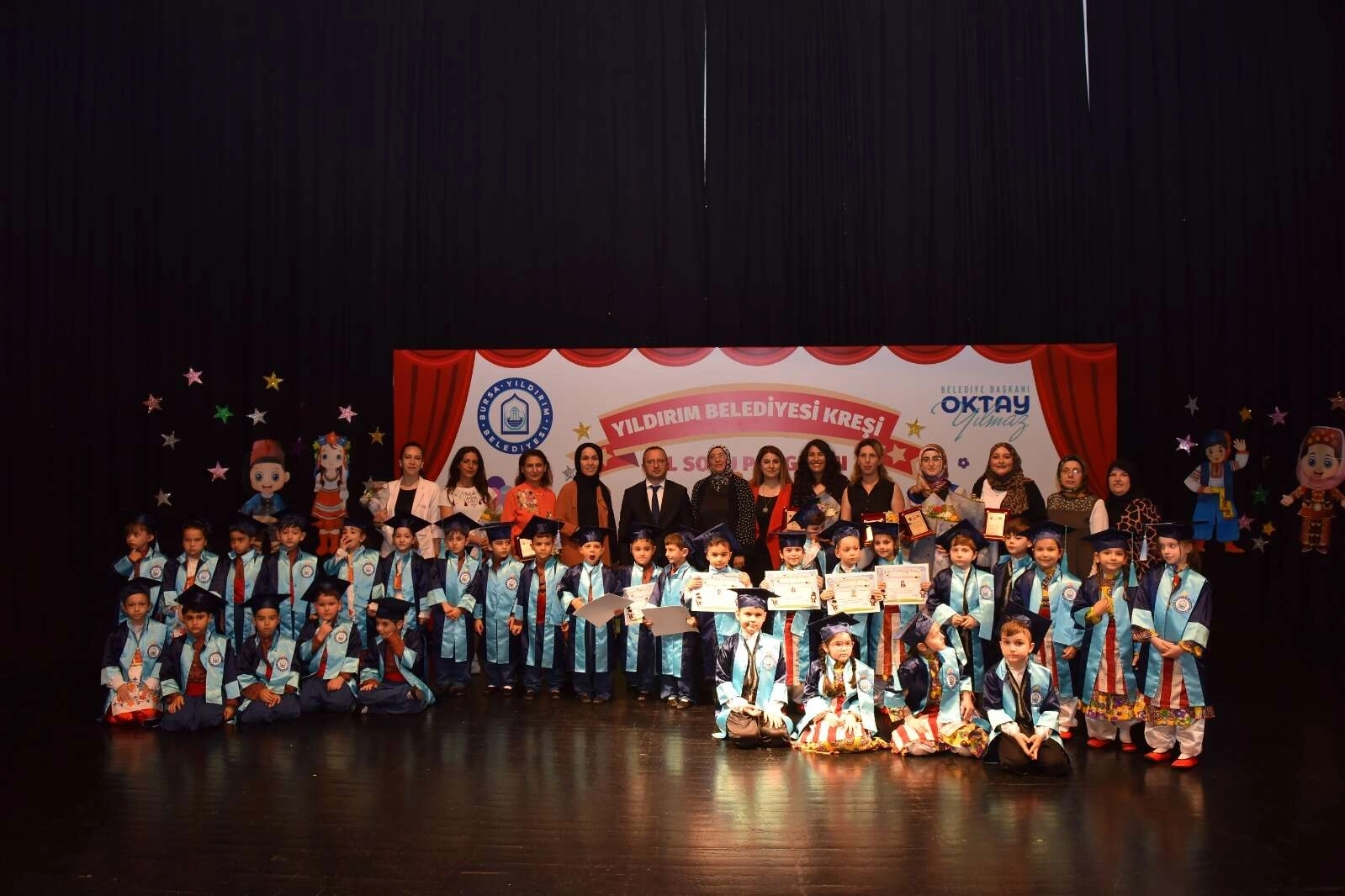 Yıldırım Belediyesi Kreşi’nde mezuniyet heyecanı yaşandı. Yıldırım Belediyesi bünyesinde faaliyet gösteren kreşte eğitim gören 32 minik mezun oldu. Barış Manço Kültür Merkezi’nde düzenlenen yıl sonu programında minikler halk dansları gösterileri ile hünerlerini sergiledi.